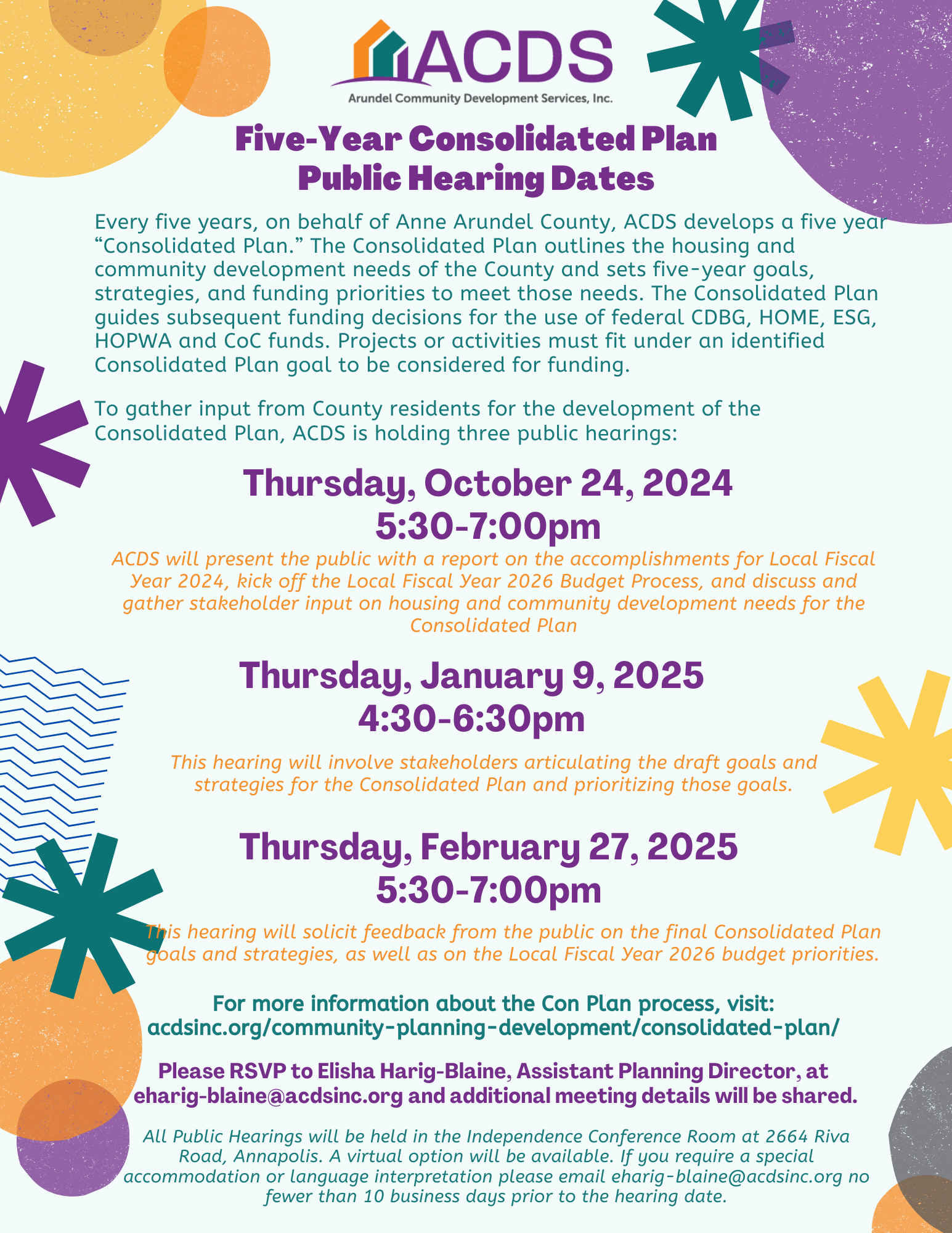 Every five years, on behalf of Anne Arundel County, Arundel Community Development Services (ACDS) develops a five year “Consolidated Plan.”