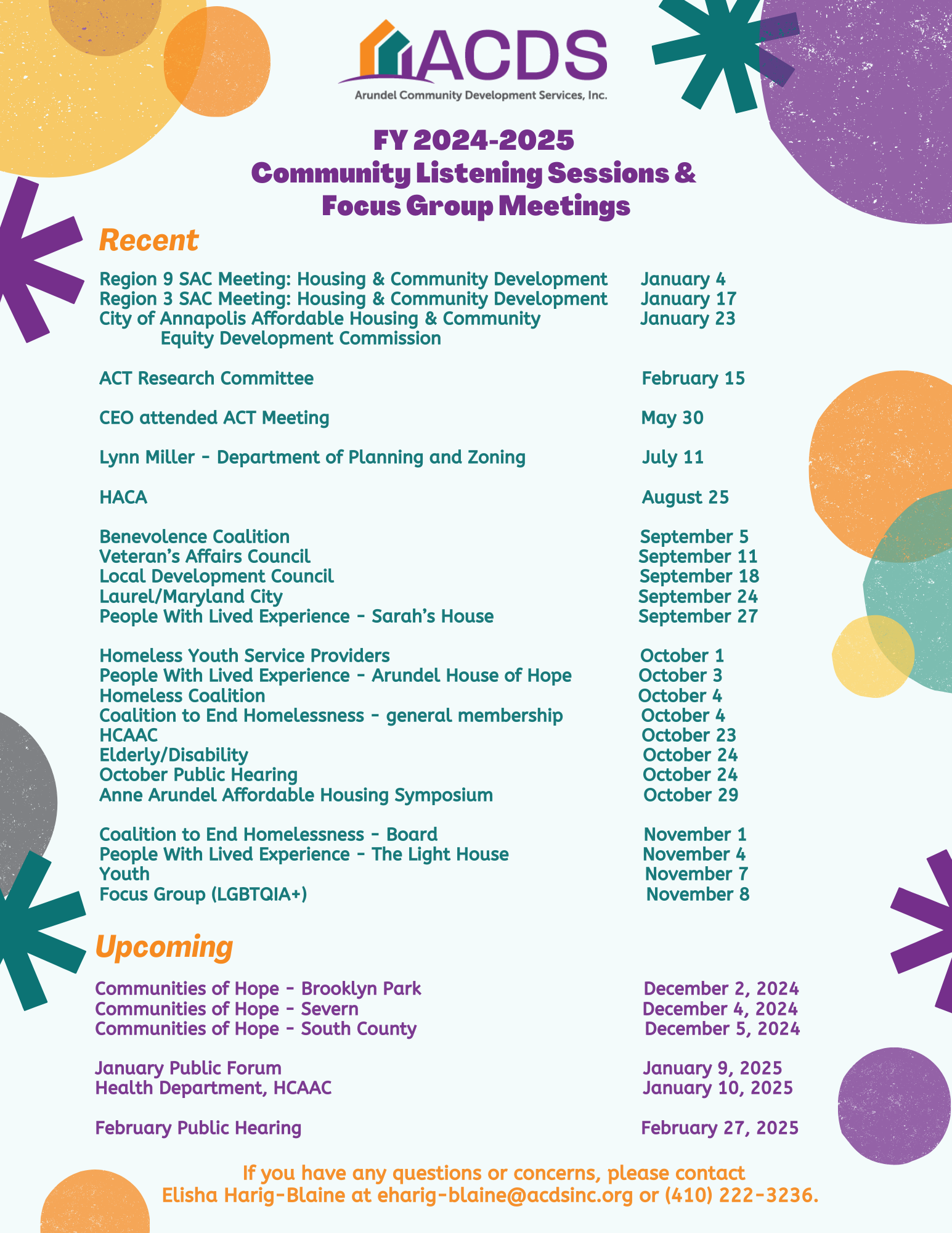 To solicit additional community input, ACDS is holding a series of small group meetings, listening sessions, focus groups, and community presentations. These are opportunities for ACDS to hear from community members and identify housing and community development needs, as well as discuss possible strategies to address those needs over the Fall and Winter of 2024.