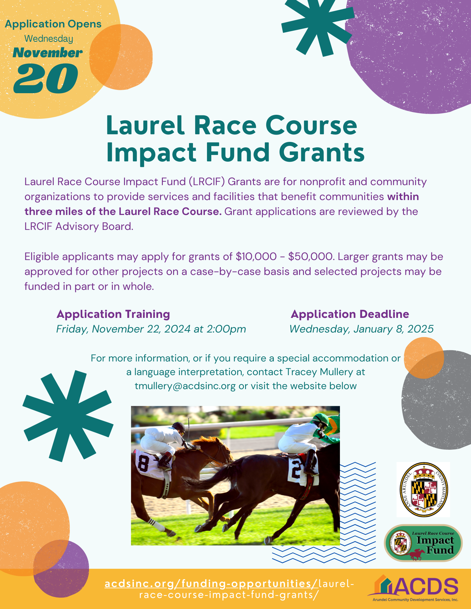 Grants for nonprofit and community organizations to provide services and facilities that benefit communities within three miles of Laurel Race Course. Grants awards range from $10,000-$50,000.