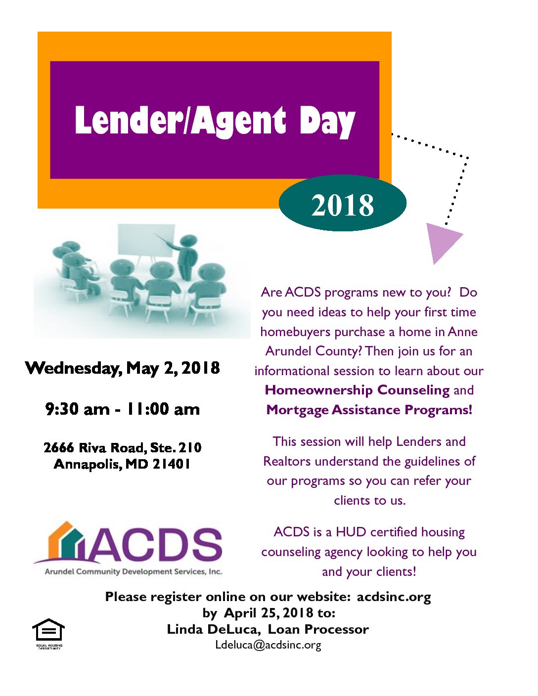 The event is designed especially for Lenders and Agents. This is a great opportunity to learn how our HUD Certified Homeownership Counseling Program and Mortgage Assistance Program can help your clients succeed in becoming homeowners in Anne Arundel County.