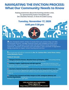 Help is available for eligible Anne Arundel County residents at risk of imminent eviction or foreclosure: Eviction Prevention Program and Foreclosure Prevention Counseling.