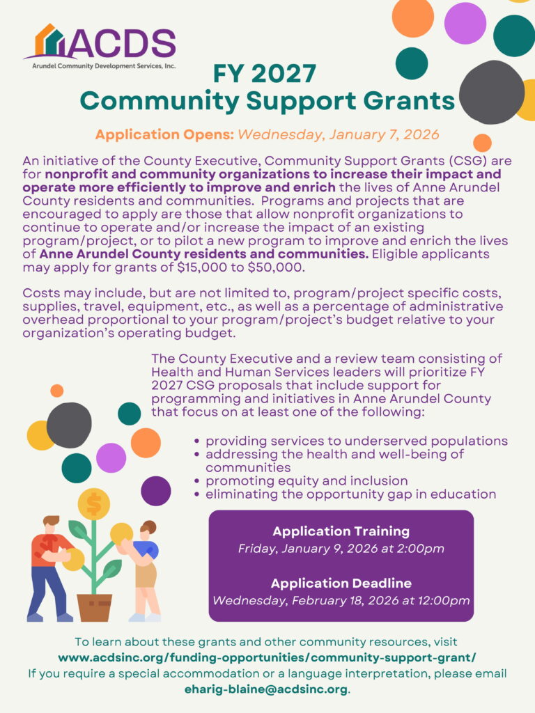 The County Executive and review team will prioritize FY2026 Community Support Grant proposals that include support for programming and initiatives in Anne Arundel County that focus on at least one of the following:
