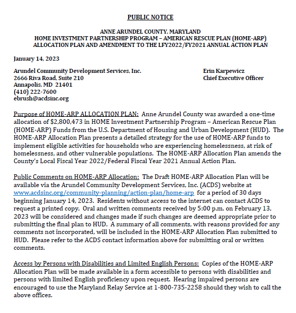 Public Comments on HOME-ARP Allocation: The Draft HOME-ARP Allocation Plan will be available for download via the Arundel Community Development Services, Inc. (ACDS) website at https://mmatzen.acds.datachievereview.xyz/community-planning-development/action-plan for a period of 30 days beginning January 14, 2023. Residents without access to the internet can contact ACDS to request a printed copy. Oral and written comments received by 5:00 p.m. on February 13, 2023 will be considered and changes made if such changes are deemed appropriate prior to submitting the final plan to HUD. A summary of all comments, with reasons provided for any comments not incorporated, will be included in the HOME-ARP Allocation Plan submitted to HUD. Please refer to the ACDS contact information above for submitting oral or written comments.