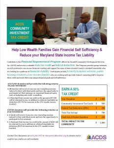 Want to “Do Good” while reducing your personal or business tax liability? Thanks to an allocation of Maryland Community Investment Tax Credits, individuals and businesses contributing $500 or more to support Financial Empowerment Counseling for Anne Arundel County’s most vulnerable residents will receive a 50% MD tax credit + the allowable federal deduction. Donate online HERE or mail your donation to: ACDS, Attn CITC, 2666 Riva Road, Suite 210, Annapolis, MD 21401